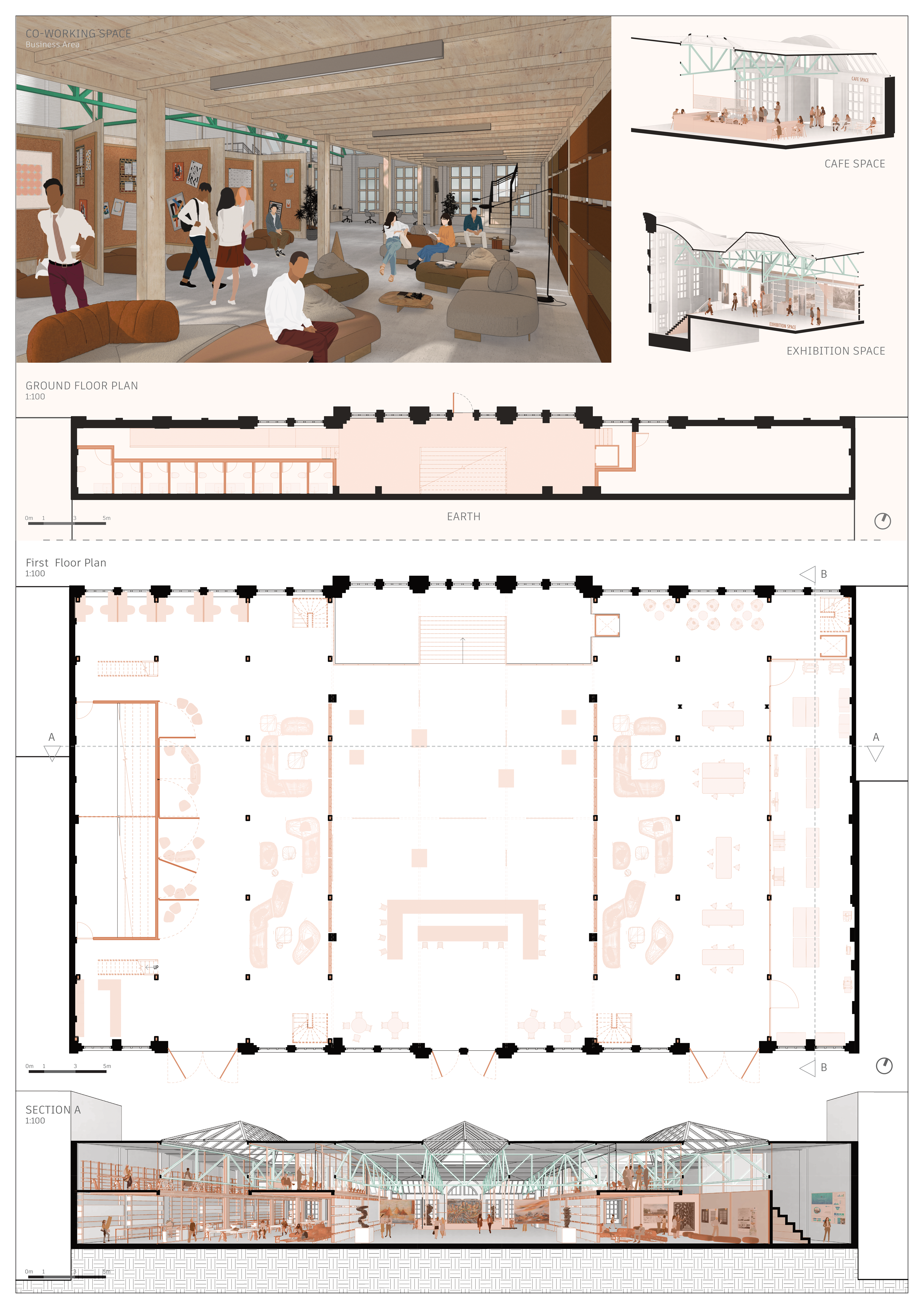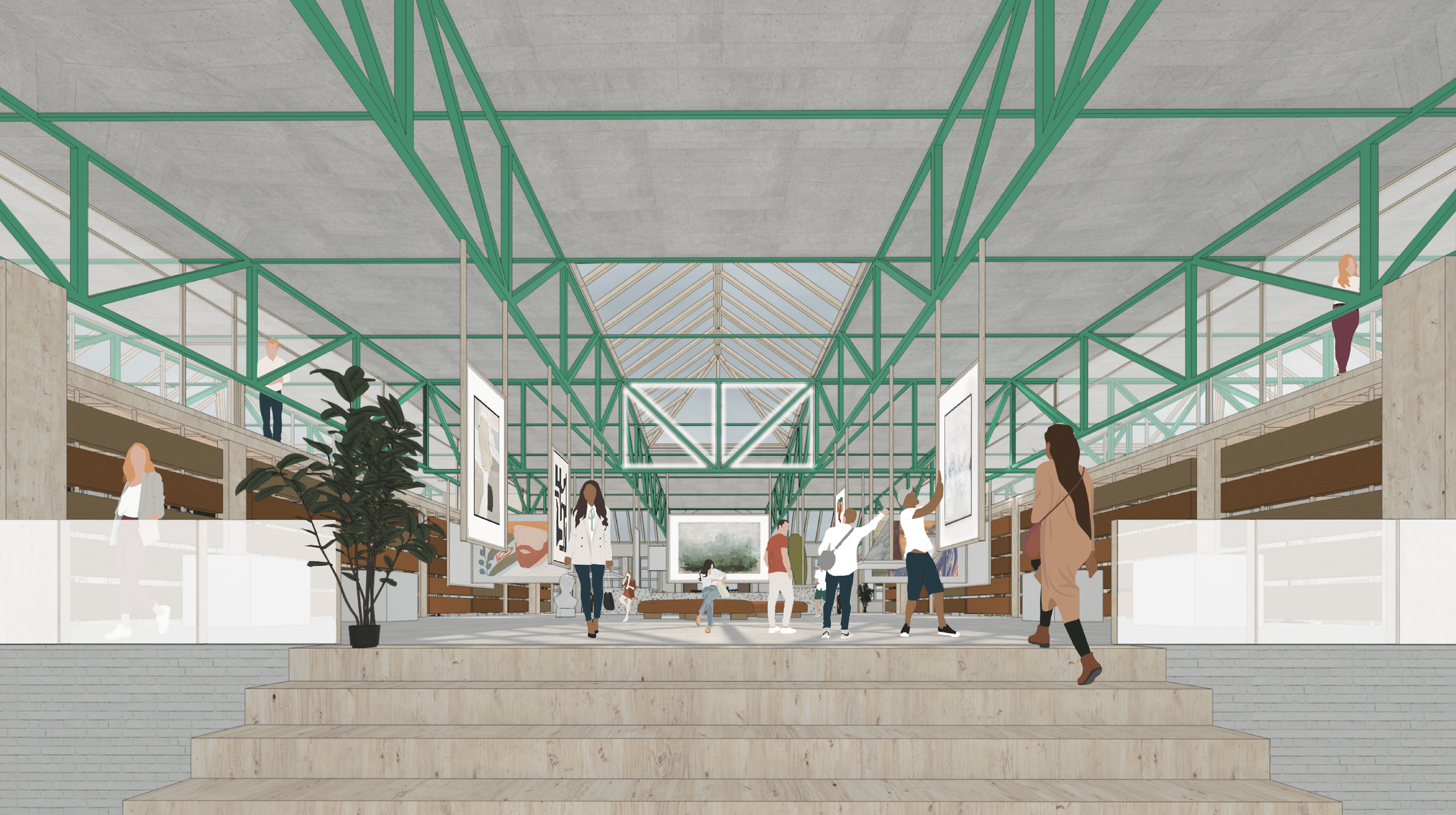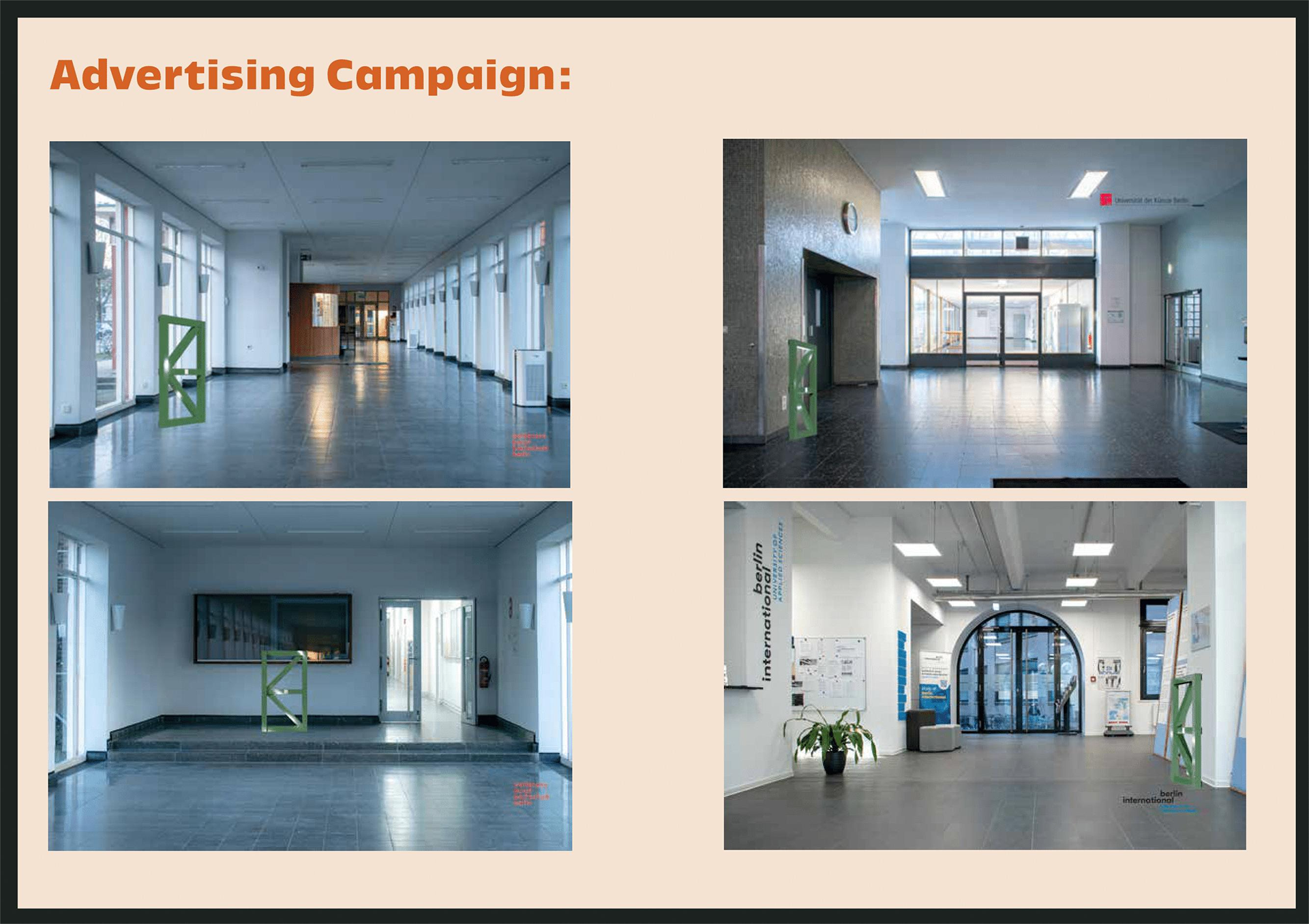 We designed both the architectural space and the complete brand identity. The interior focuses on flexible, multi-use areas that adapt to different needs: quiet study zones, collaborative workspaces, and exhibition areas. The branding reflects this flexibility through modular, playful visual language.