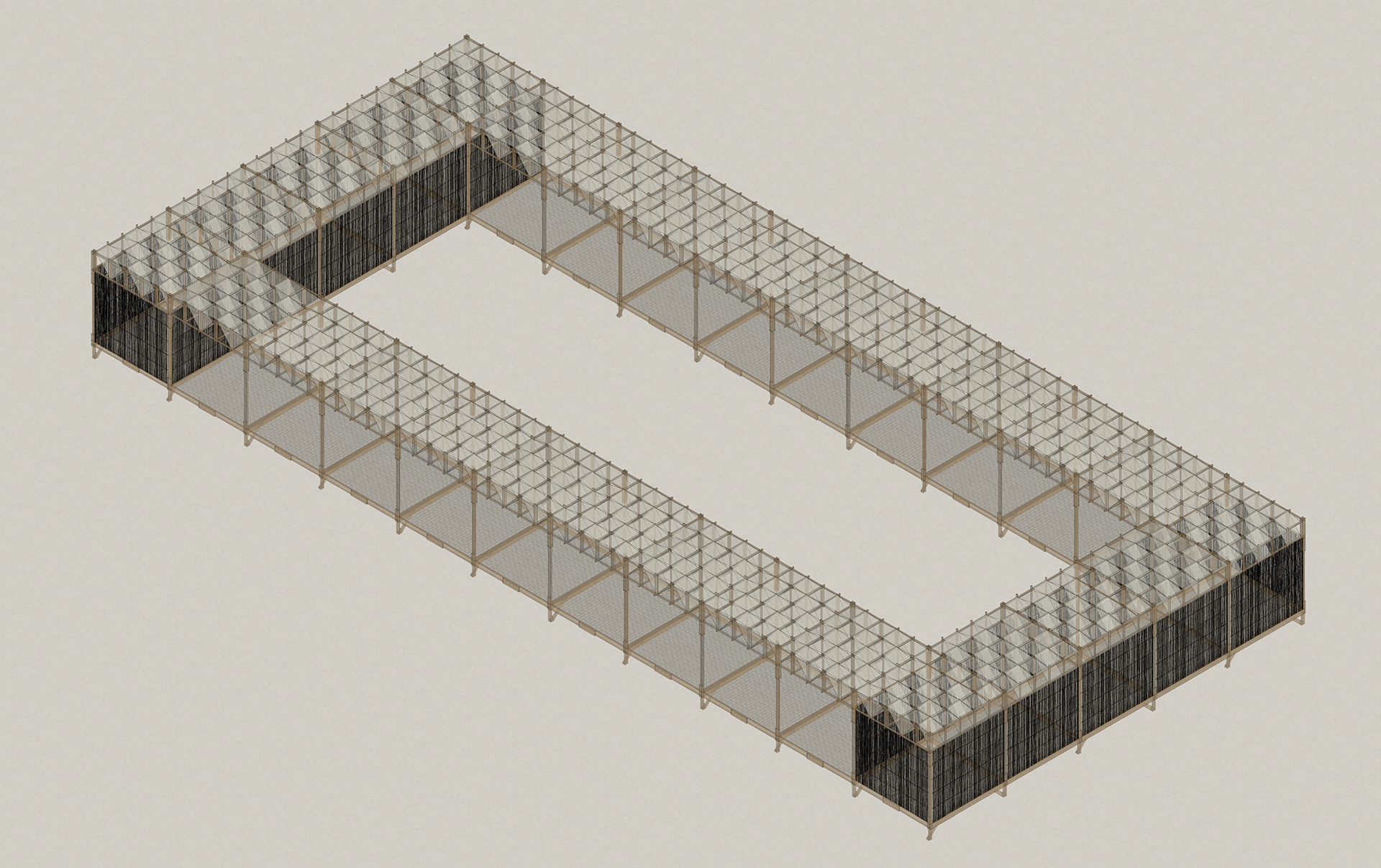 The pavilion's structure is all about how simple modular elements create a complex form. I developed all the 3D models, visualizations, and technical axonometric drawings to understand how the pieces fit together. The construction method itself is really interesting: wooden slats connected with screws, with textile woven through the structure. The textile doesn't just add visual softness, it actually plays a structural and spatial role in defining the pavilion.